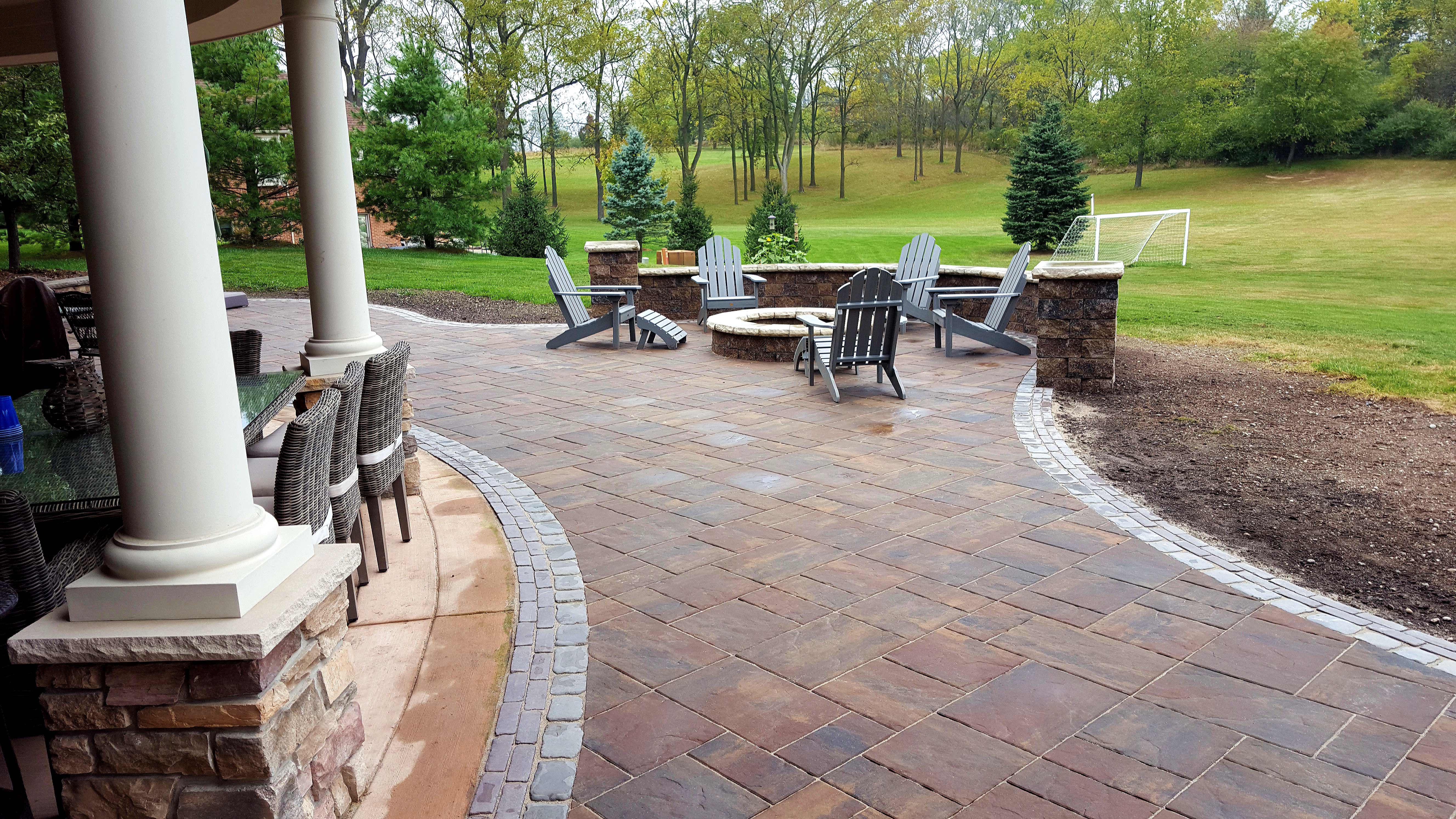 We installed this paver patio and walkway in Plymouth, MI a number of years ago when Unilock first came out with their line of the Beacon Hill Flagstone paver. Our clients chose to use a double border for the perimeter which made this paver project very unique. The border consisted of Unilock Copthorne and Courtstone. We also installed a seating wall, pillars and fire pit made of Unilock Estate Wall and Ledgstone coping. Our team really enjoyed building this project and took a lot of pride in their craftsmanship. If you are looking to build a patio, walkway or driveway made of brick pavers in the Plymouth or Northville area, give us a call today!